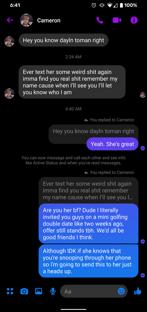I 've been at work but also I 'm not going to be inflammatory by getting into this. I 've done the controlling/going-through-her-phone thing before and it doesn 't help, it just makes things worse. Dayln is s obviously very loyal and committed towards whatever issues y 'all might have so follow her lead on that instead of doing this
